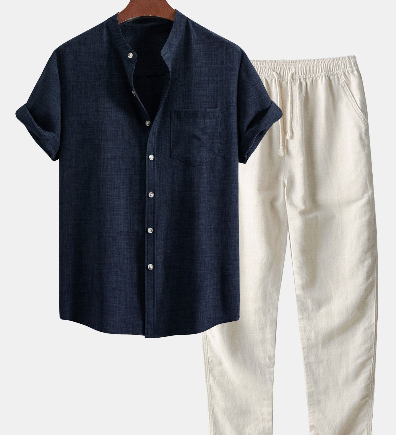 Chemise à manches courtes avec col chinois et pantalons en lin à pattes droites