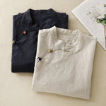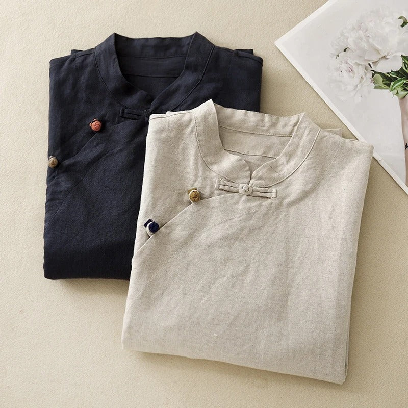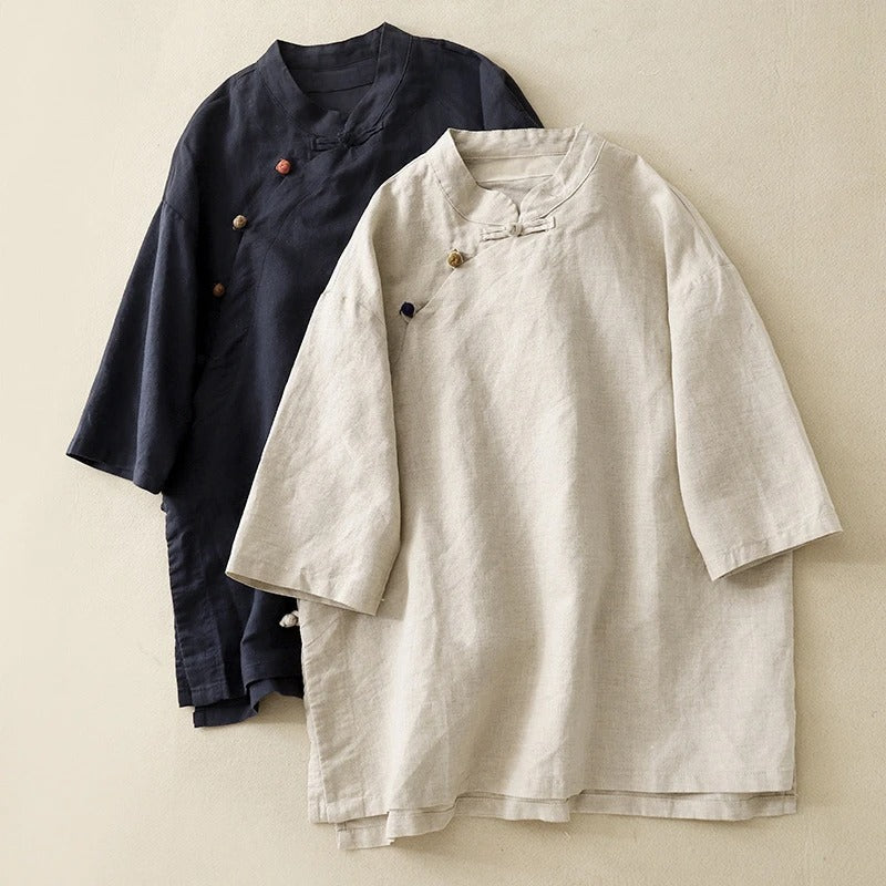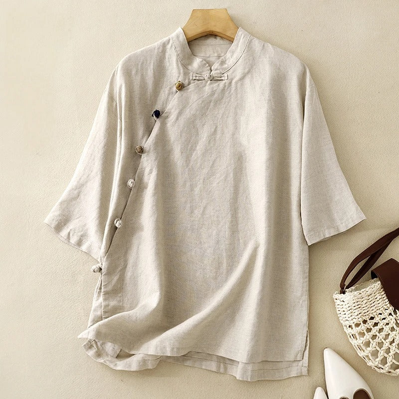 Confectionné en lin pur, ce chemisier se déploie en douceur grâce à ses boutons noués sur le côté et son ourlet arrondi. Un col mao apporte une touche de sérénité discrète — tissé pour les matins tranquilles et les rituels de thé chuchotés.